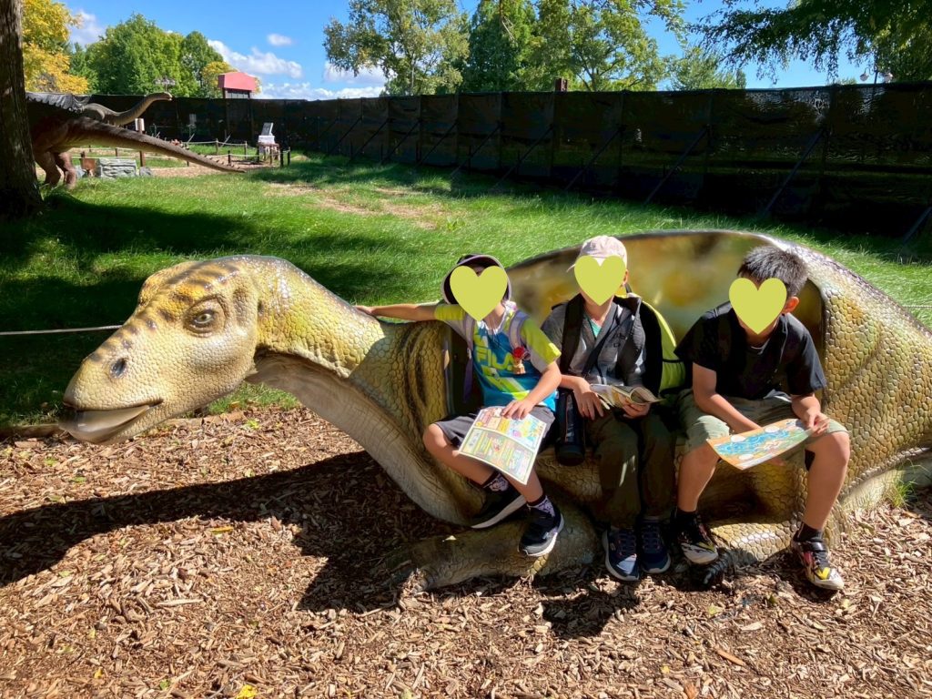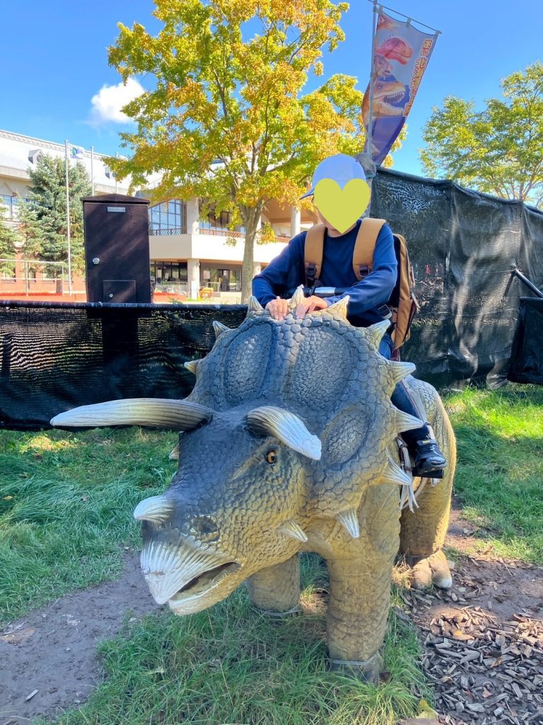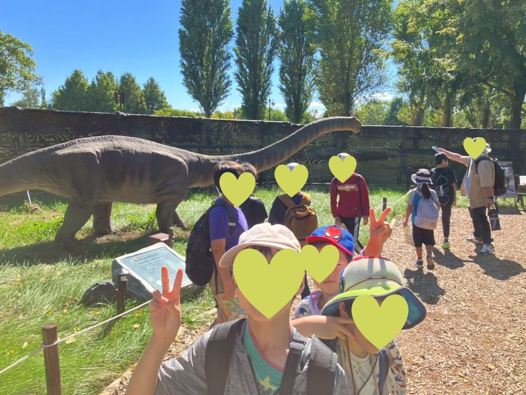 フォトスポットでは、恐竜に乗ってポーズ!低学年の子どもたちも周りを見て小さい子にさりげなく道を譲ってあげるなど、思いやりやリーダーシップを発揮してくれました。