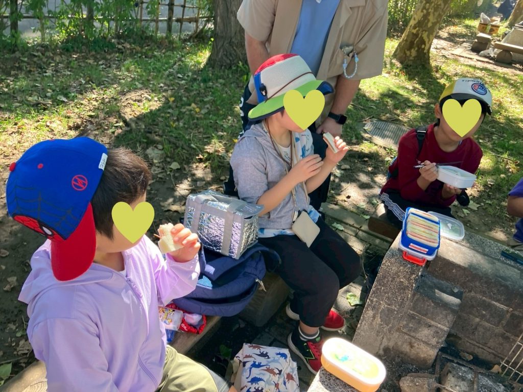 お昼ご飯はバーベキューコーナーで。「焼肉のにおいがする〜」「お腹すいたね!」と、みんなでおしゃべりを楽しみながらのランチタイム。食事を通してコミュニケーション力や共感性を高める時間にもなりました。