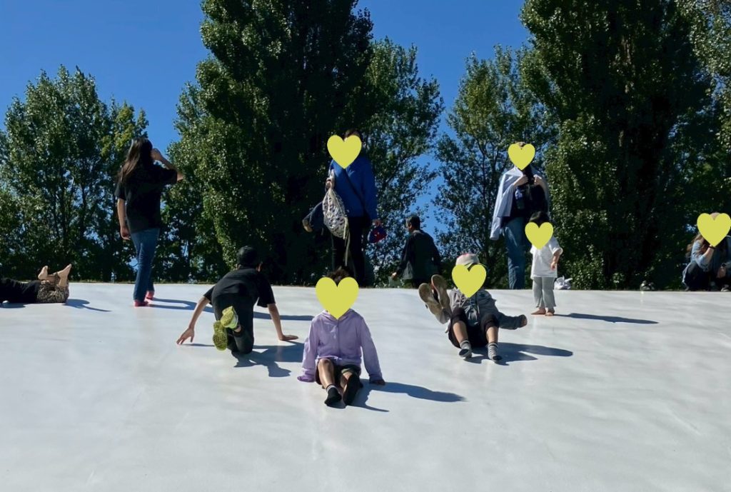 また、恐竜ベンチでのひと休みでは、そよ風を感じながら「気持ちいいね」とお話しする子も。五感を通して自然に親しむことで、感覚統合や情緒の安定にもつながっています。