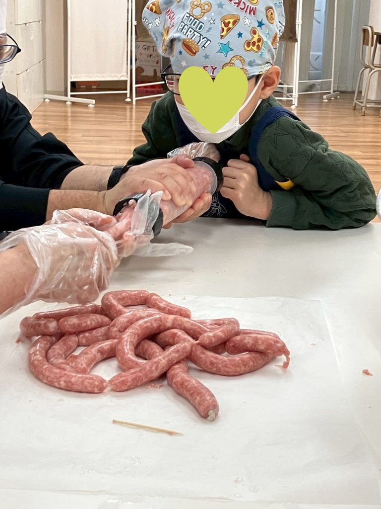 さあ、いよいよ肉を詰める作業です。美味しくするために入れたバラ肉の細切れが悪かったのか、思い切りバーを押してもなかなか肉は羊腸に入っていきません。パン組の人たちもチャレンジしてみましたが、びくとも動きません。そこで高学年の人たちがぐいぐい押すと、するするっと肉は入っていきました。さすがです。にゅるにゅると肉を入れてひねると、見かけは本当にソーセージです。