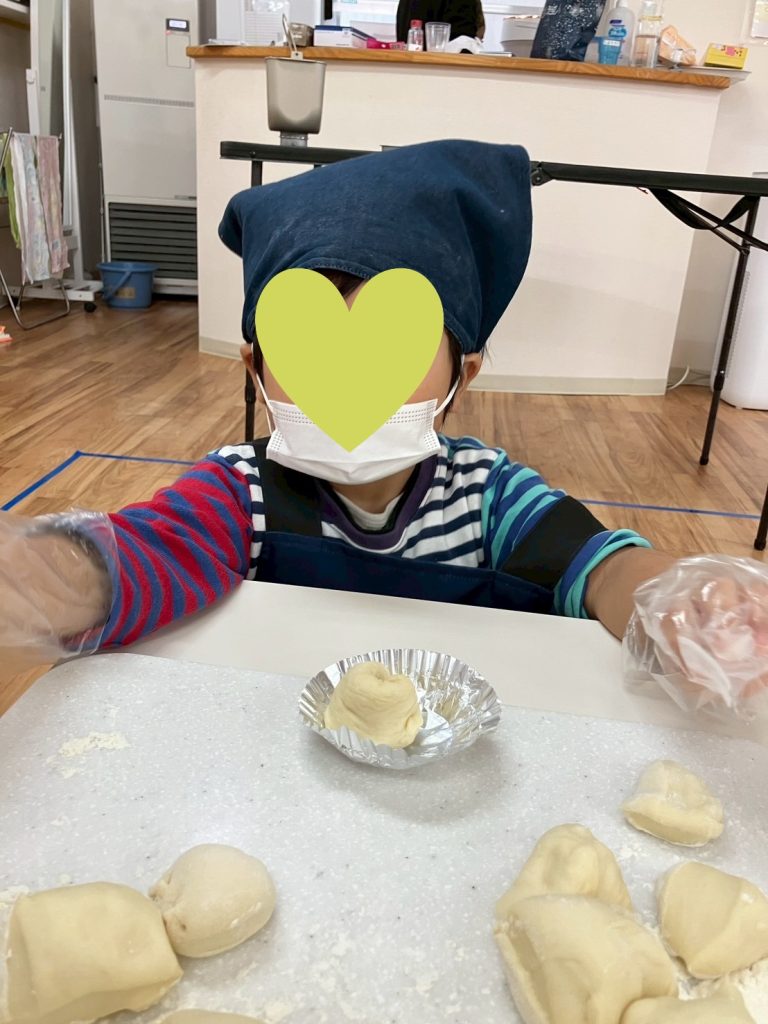 ビニル手袋越しのふわふわさらさらのパン生地の手触り・・・ついつい粘土のように自分の好きな形にしてしまう子もいます。一人4つくらい作ったでしょうか。