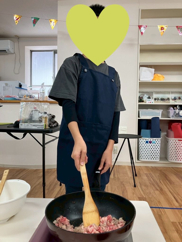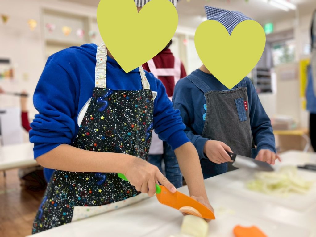包丁を使う場面では、包丁の持ち方や手の添え方を確認し、 職員の見守りのもと手の位置や順番を確認しながら、野菜やお肉を丁寧に切る姿が見られました。食材の大きさをそろえることや、順番を待って交代することで、集中して作業を行う姿が見られました😀