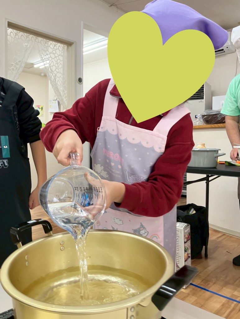 今回はクッキング活動として、ハヤシライス作りを行いました。最初に分量を確認しながら水を計って調理の準備を行いました。