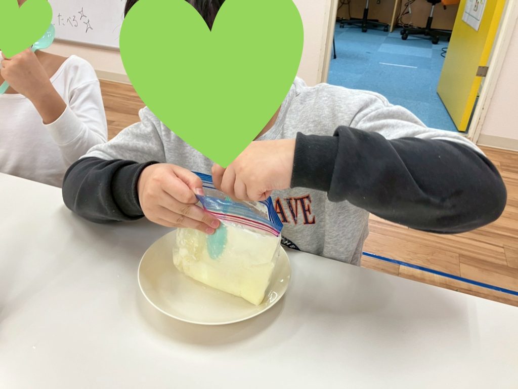 この日は、外遊びとクッキングを組み合わせた活動を行いました。まず出発前に、アイスの素をジップロックに入れ準備をし、公園へ向かいました。