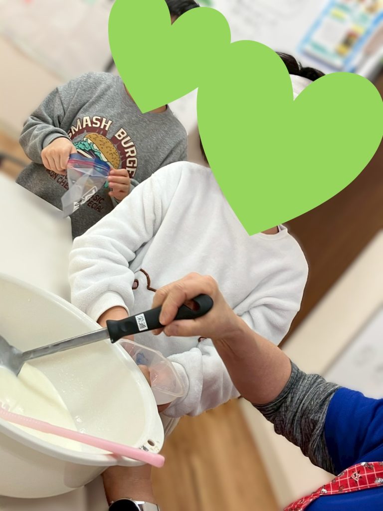 たくさん体を動かした後は、みんなでアイスの様子を確認し、いよいよ試食の時間です🍦「冷たい!」「おいしい」と自分たちで作ったアイスを味わい、作る工程から食べるまでを経験することで、達成感や満足感を感じる姿が見られました☺